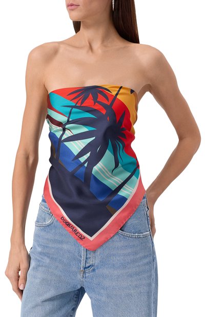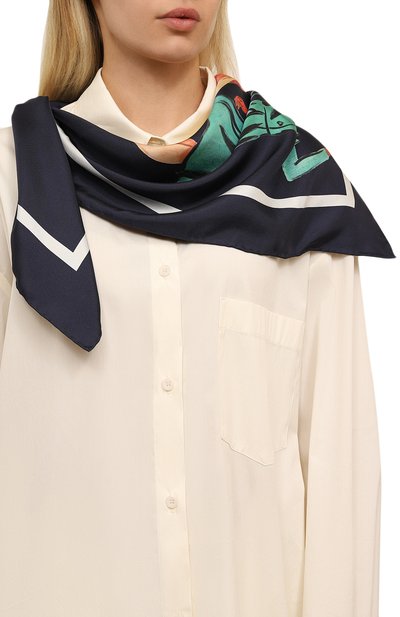 Квадратный платок с подшитыми вручную краями выполнили из шелкового твила. Модель декорировали мотивом Passantes с небольшим логотипом бренда.