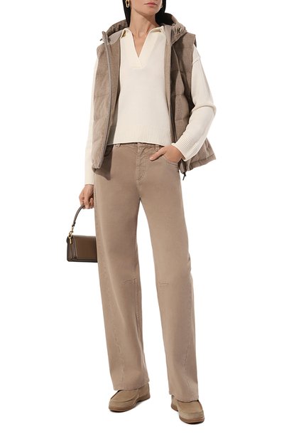 Джемпер с V-образным вырезом и воротником-поло изготовили из вискозного жаккарда с добавлением ламинированных нитей. Свободная модель со спущенной линией плеч впишется в расслабленный повседневный образ.