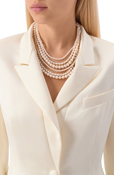 Колье с крупными звеньями выполнили из латуни и стали с позолотой. Аксессуар с застежкой-карабином украсили кольцом из жадеита, а объем изделию придали множеством переплетенных цепочек и нитей жемчуга.