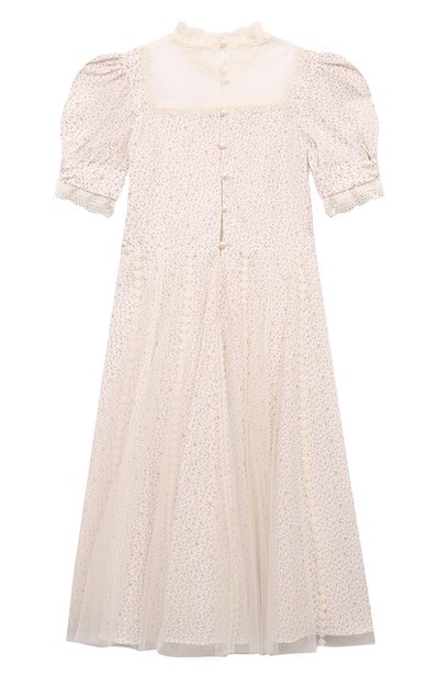 Платье с драпировкой вдоль круглой горловины выглядит как комплект из топа с плиссированной отделкой и юбки. Модель из органического хлопкового перкаля украсили ажурной вышивкой в виде ананаса и отделкой jour échelle по краям. Изделие застегивается пуговицами сзади.