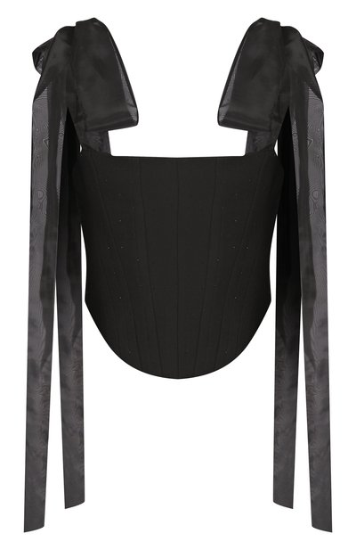 Корсетный топ Lou Lou, покрытый кристаллами, сшили из костюмной ткани на основе вискозы. Модель с фигурным низом и рельефными швами дополнили бретелями из шифоновых лент, завязывающимися на банты. Сзади изделия предусмотрели молнию.