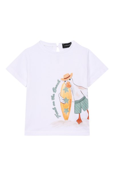Футболку с пуговицей сзади и принтом спереди выполнили из джерси, изготовленного из органического хлопка, сертифицированного GOTS. В комплект включили плавки-шорты с регулируемым эластичным поясом.