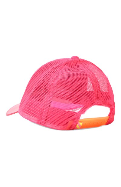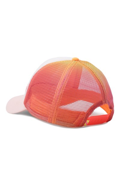 Бейсболку из хлопка дополнили сетчатыми клиньями. Изогнутый козырек и тулью, декорированную патчем в виде мороженого, покрыли пайетками. Возле пластикового ремешка расположили фирменный ярлык.