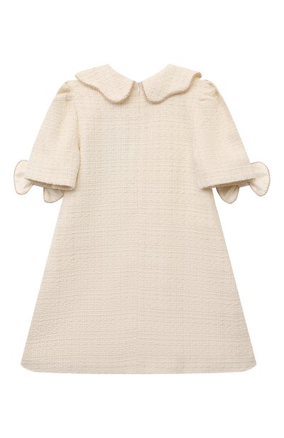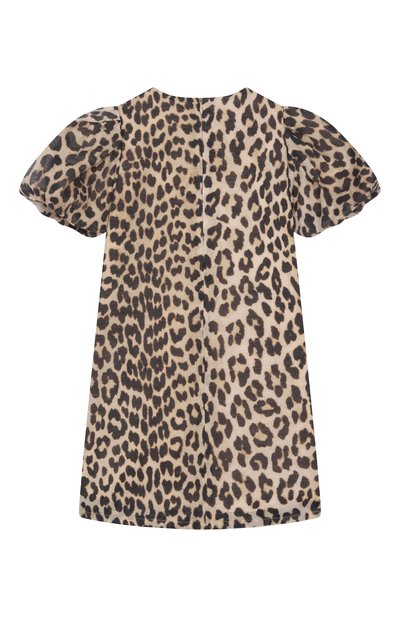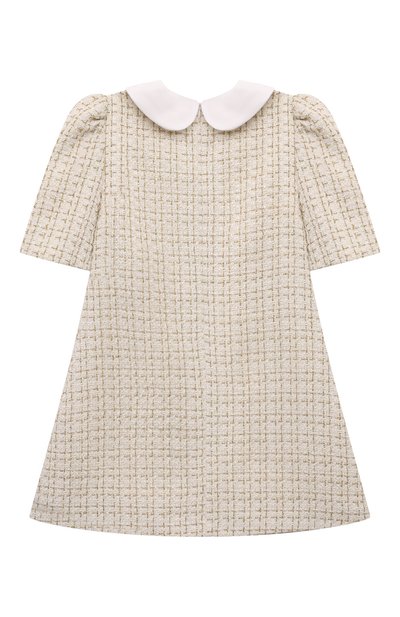 Платье с хлопковым подкладом выполнили из сетки, полностью покрытой имитацией перьев и пайетками. Левый рукав подчеркнули патчем с логотипом марки. Модель застегивается пуговицей на спинке.