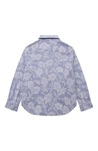 Полосатую рубашку с закругленными манжетами, воротником «мандарин» и фигурным низом сшили изо льна. Модель на перламутровых пуговицах украсили небольшой эмблемой, вышитой контрастной нитью.