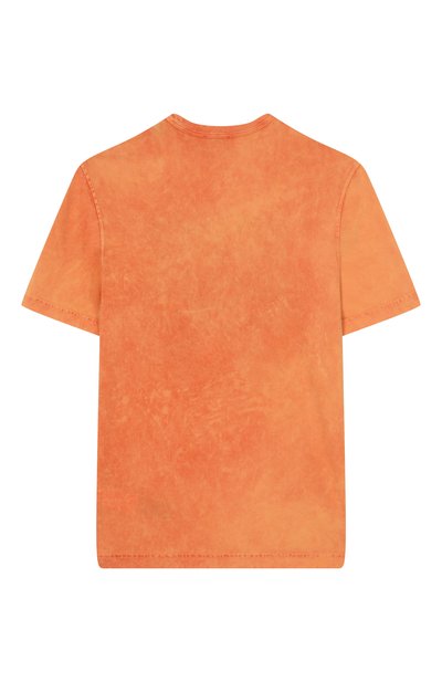 Для пошива футболки с горловиной и манжетами контрастного цвета использовали джерси из органического хлопка. Модель с заниженной линией плеча украсили крупным логотипом марки спереди.