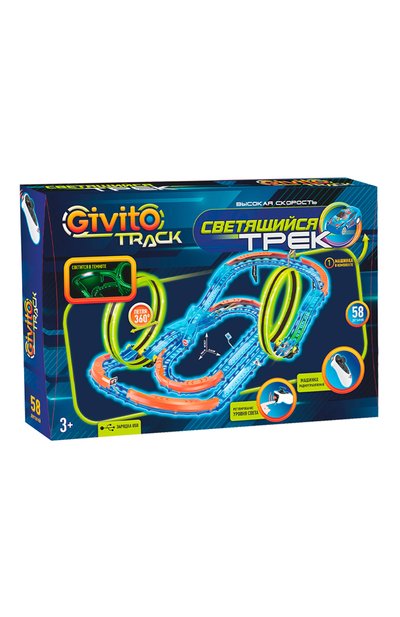 Гибкий гоночный автотрек Givito с тремя петлями 360° состоит из 51 детали. Петли светятся в темноте, а сама машинка оставляет за собой неоновый шлейф на дороге. Движение автомобиля, аккумулятор которого заряжается через USB-порт, можно корректировать пультом управления на двух батарейках типа ААА (в набор не входят). В комплекте – лист с наклейками.