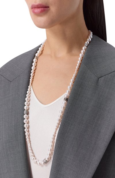 Колье Sparkle с застежкой из ювелирного сплава с родиевым покрытием собрали из речного жемчуга. Аксессуар декорировали крупной барочной жемчужиной, инкрустированной фианитами.