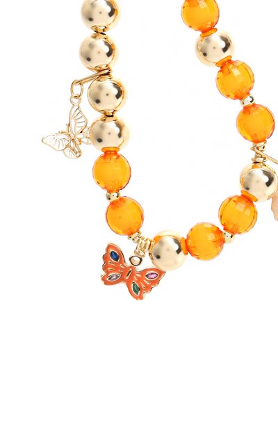 Колье собрали вручную из полупрозрачных и перламутровых бусин, которые разбавили подвесками разной формы. Регулируемый аксессуар с брендированной пластиной дополнили тонкой цепочкой.