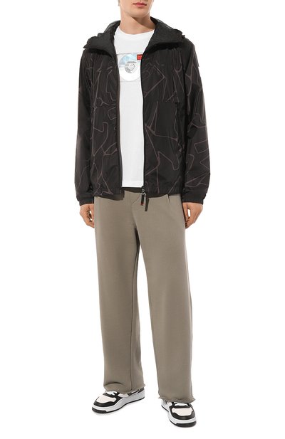 Куртку с капюшоном и ассиметричной супатной застежкой выполнили из материала с добавлением синтетических волокон. Модель дополнили тремя карманами с молниями: по бокам и на одном из рукавов реглан.