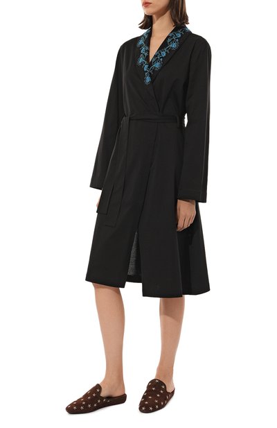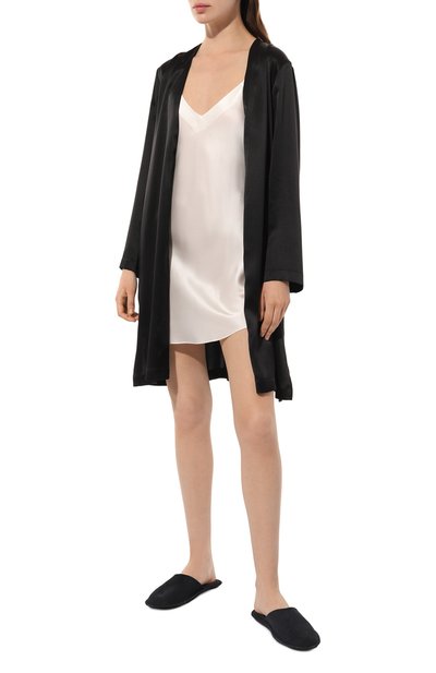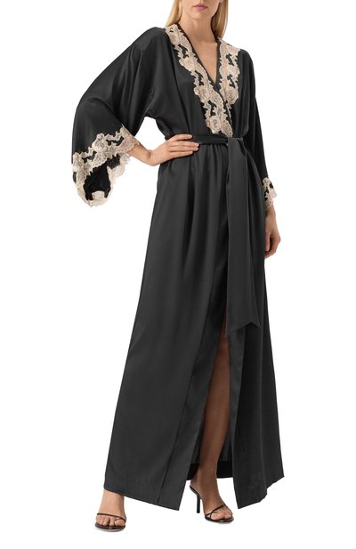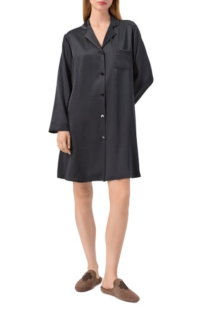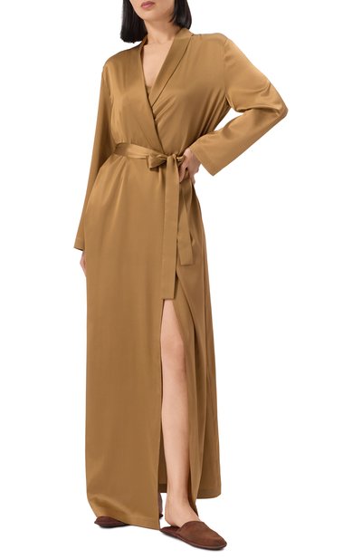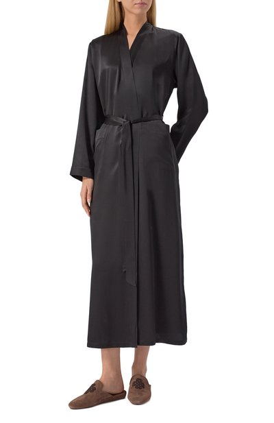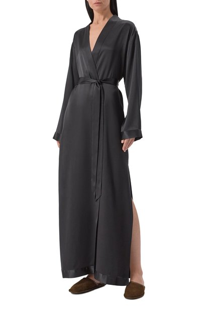 Длинный халат с двумя боковыми карманами и съемным поясом-лентой выполнили из шелка с добавлением эластана. Манжеты и низ подчеркнули отстрочкой в тон.