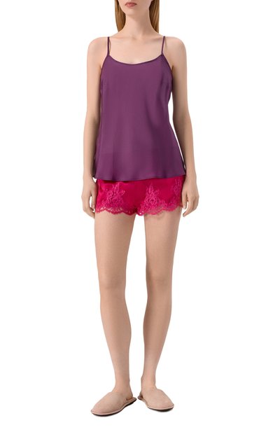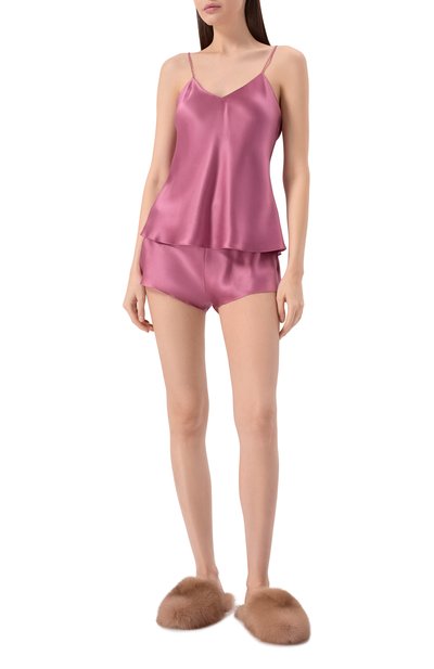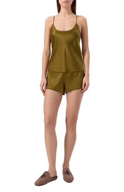 Приталенный топ с U-образными вырезами спереди и сзади сшили из шелкового атласа. Посадку модели можно регулировать слайдерами на узких бретелях.