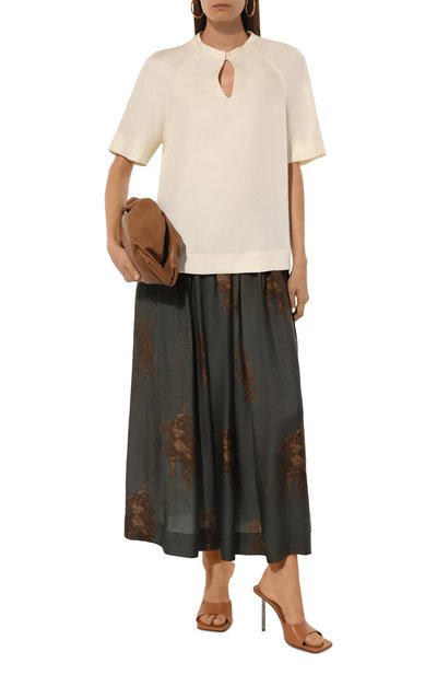 Блузка с воротником аскот и короткими рукавами с отворотами сшита из струящейся вискозы. Легкая модель прямого кроя застегивается золотистыми брендированными пуговицами.