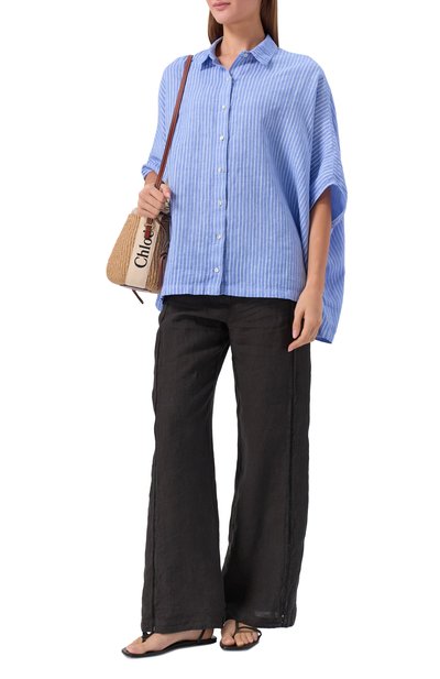 Блузку отворотами на коротких рукавах сшили из тонкой вискозной ткани с брендированным паттерном. Модель с золотистыми пуговицами, украшенными эмблемами марки, дополнили воротником аскот, завязанным крупным бантом.