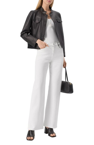 Широкие джинсы с пятью карманами сшили из денима с добавлением лиоцелла. Модель с серебристой фурнитурой украсили сзади небольшим патчем с логотипом марки.