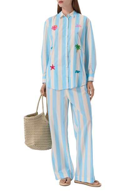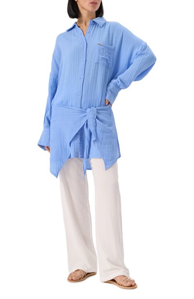Рубашку с однотонными манжетами и воротником выполнили из хлопкового поплина в полоску. Модель с супатной застежкой дополнили нагрудным карманом, подчеркнутым кристаллами. В комплект включили узкий пояс.
