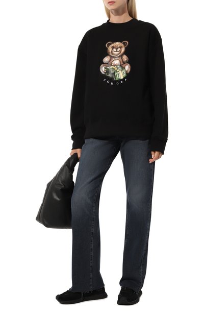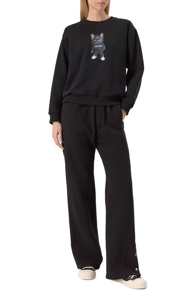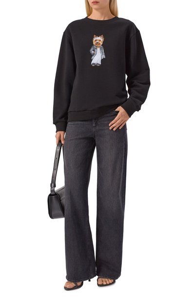 Свитшот свободного кроя сшили из хлопкового трикотажа, укрепленного полиэстером. Модель с манжетами, горловиной и поясом в рубчик украсили принтом с изображением таксы.
