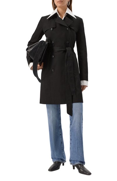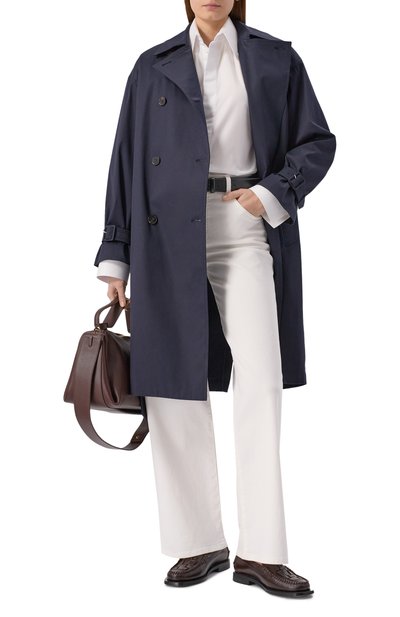 Двубортный тренч с отлетной кокеткой, патами на рукавах и погонами выполнили из шерстяной ткани. Модель с боковыми карманами и длинной шлицей дополнили широким ремнем с прямоугольной обтяжной пряжкой.