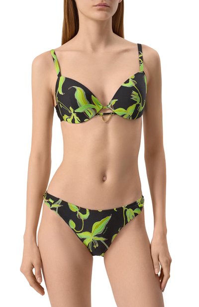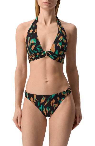 Плавки Feline Energy с анималистичным принтом Green Panther сшили из стрейчевого быстросохнущего материала на основе полиамида. По бокам модель допо лнили золотистыми брендированными перемычками, формирующими мелкие драпировки.