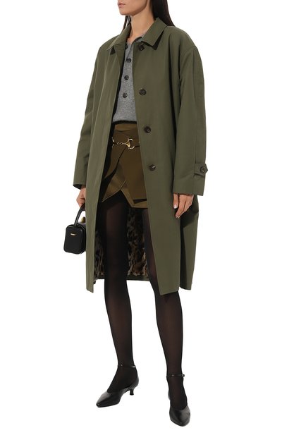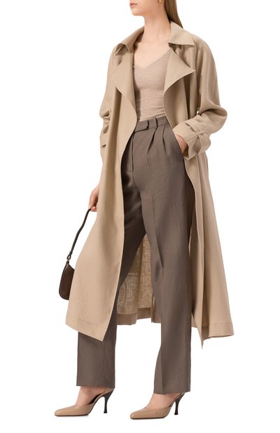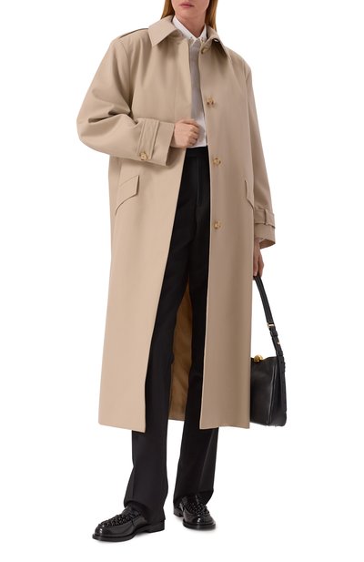 Плащ с высокой шлицей сзади и широкими отворотами на рукавах, демонстрирующими атласный подклад, дополнили боковыми карманами. Модель кроя oversize сшили из плотной хлопковой ткани с добавлением полиэстера. В комплекте — пояс-лента.
