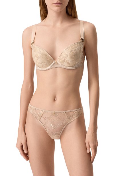 Трусы-танга из коллекции Sound of Heart выполнили из стрейчевого тюля с мерцающей цветочной вышивкой. Модель с атласной отделкой и хлопковой ластовицей украсили спереди золотистой подвеской с кристаллами.