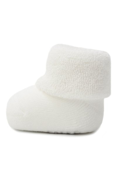 Носки Erstlingsringel с махровой изнанкой изготовили из пряжи We Care на основе органического хлопка. Модель в полоску украсили отворотом на паголенке и контрастным логотипом на подошве.