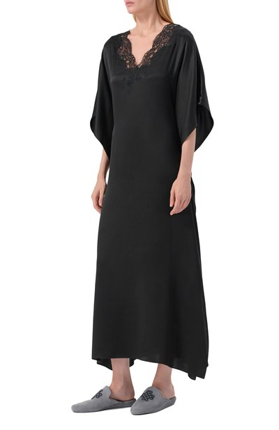 Длинную сорочку из шелкового атласа украсили кружевом Caudry с цветочным мотивом. Модель дополнили узкими бретелями со скользящими слайдерами.
