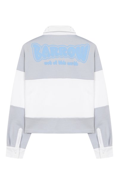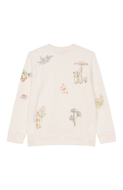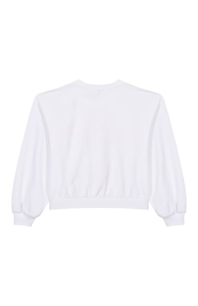 Свитшот с эластичными манжетами и поясом в полоску выполнили из хлопкового трикотажа стрейч. Модель декорировали принтом в виде котенка и логотипом из стразов, а рукава реглан подчеркнули фактурным рюшами.