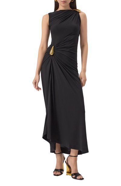 Платье на потайной молнии сзади выполнили из слегка эластичного материала на основе вискозы и акрила. Спереди модель с подкладкой украсили серебристой бахромой.