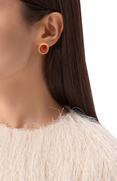 Круглые серьги из латуни покрыты тонким слоем золота 585-й пробы. Украшение с застежкой-пусетой дополнено вставкой из полированного красного агата.