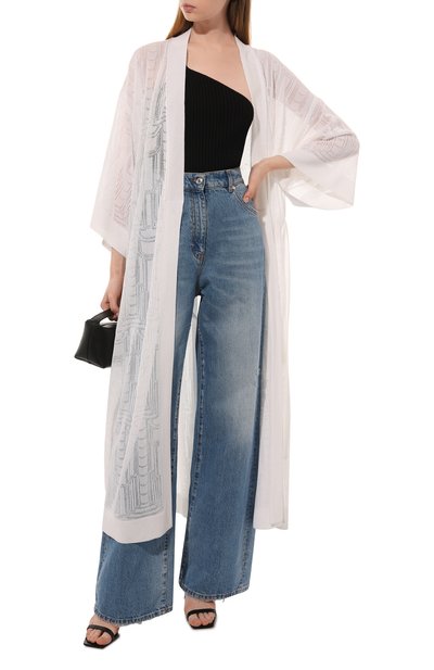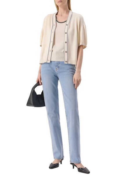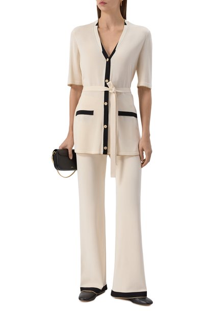 Кардиган с двумя рельефными полосами сзади выполнили из шелкового трикотажа с добавлением кашемира. Пуговичную планку и V-образную горловину модели подчеркнули контрастным кантом и серебристым бисером.
