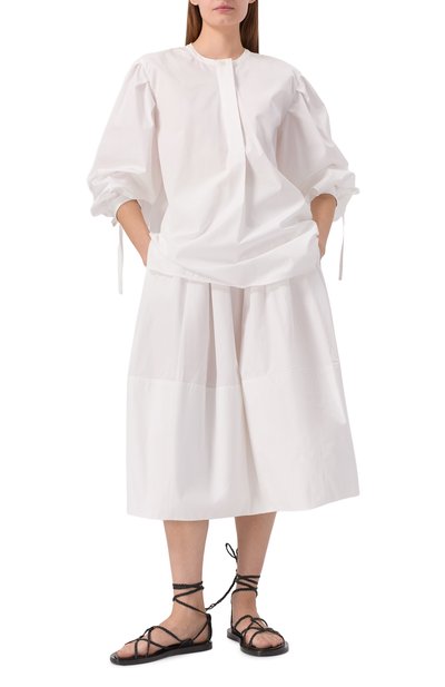 Юбку-карандаш с высокой шлицей и широким поясом со шлевками выполнили из хлопкового твила. Модель с супатной застежкой дополнили двумя карманами по бокам и листочкой сзади.