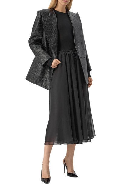 Миди-юбка А-силуэта выполнена из струящегося вискозного атласа. Однотонная модель без декора может стать универсальной основой образов разной степени сложности.