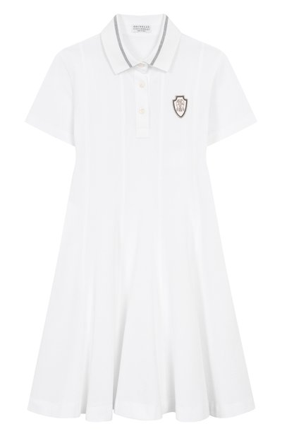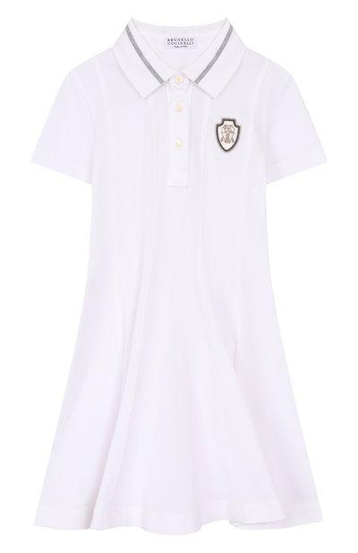 Двубортное платье сшили из эластичного хлопкового поплина, а прямоугольные лацканы — из жаккарда с узором PB Labyrinth. Приталенная модель застегивается золотистыми пуговицами Chain Lion.