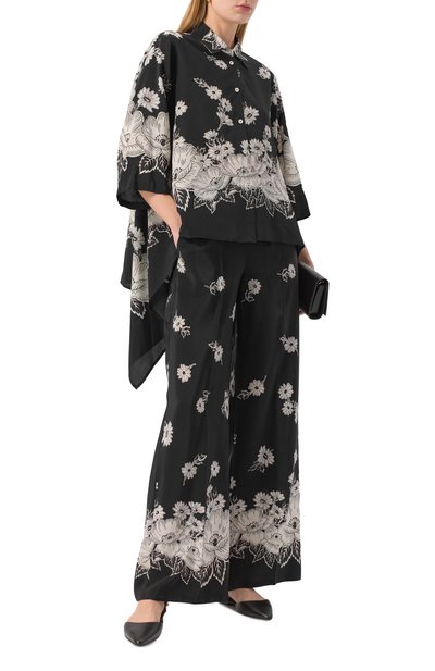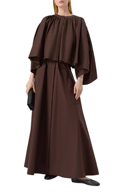 Блузку с эластичным верхом и манжетами укороченных рукавов выполнили из хлопка. Модель с фестончатым подолом и открытыми плечами украсили вышивкой сангалло.