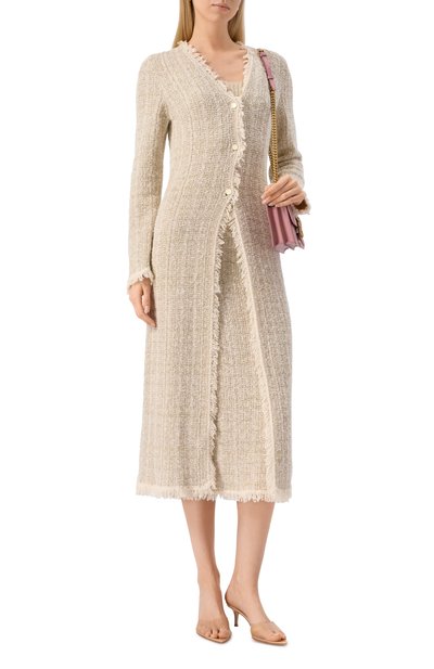 Длинный кардиган с ажурным геометрическим узором связали из хлопковой пряжи, укрепленной нейлоном. Модель с V-образным вырезом застегивается пуговицей, обтянутой трикотажем в тон.