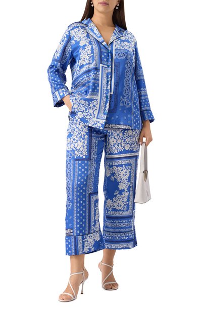 Блузу со спущенной линией плеч выполнили из гладкого полисилка с принтом, напоминающим чешую. Модель дополнили отложным воротником и манжетами на двух пуговицах.