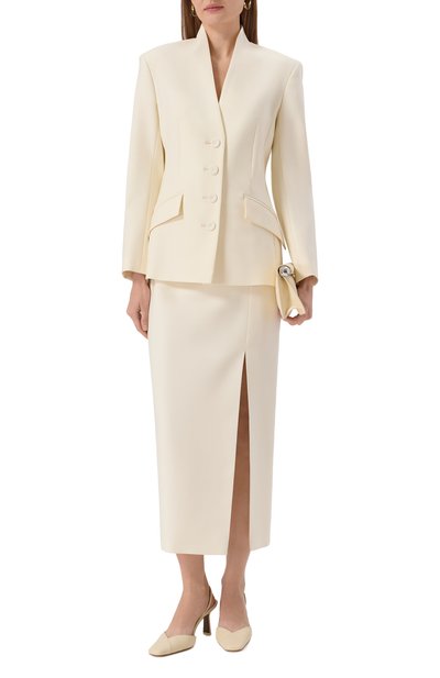 Жакет с V-образным вырезом, фигурным низом и асимметричными краями рукавов сшили из льняной ткани с добавлением полиэстера. Модель с узором под змеиную кожу на крупных пуговицах украсили на спинке тюлевым треугольником-чехлом с шунгитом внутри.