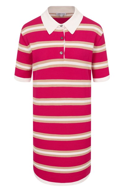 Платье-поло прямого кроя сшили из хлопкового трикотажа в полоску. Эластичная модель с широким контрастным воротником застегивается тремя перламутровыми пуговицами.