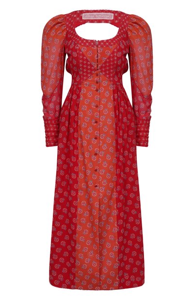 Приталенное миди-платье с объемными рукавами, манжетами в складку и вырезом на спинке выполнено из хлопка с авторским принтом. Модель с длинными лентами сзади застегивается потайными крючками и пуговицами спереди.