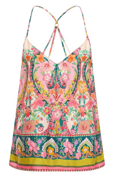 Топ из коллекции Libertine en Fleurs выполнили из вискозы с принтом Libre Eclosion. Посадку модели можно регулировать бретелями с соединительным кольцом сзади.
