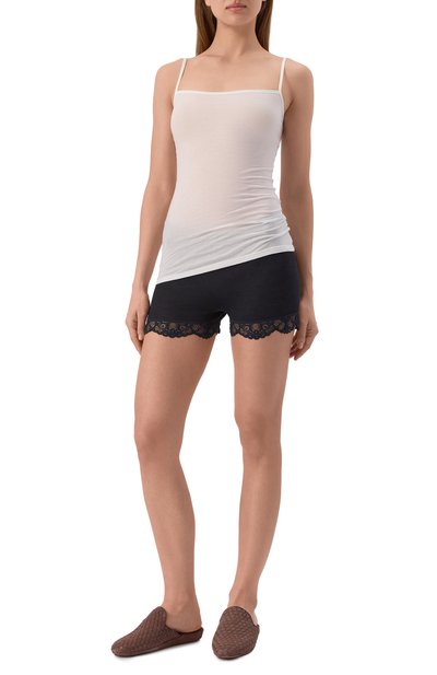 Для пошива удлиненного топа использовали джерси из мерсеризованного хлопка Supima. Облегающую модель из линии Ultralight дополнили узкими регулируемыми бретелями.