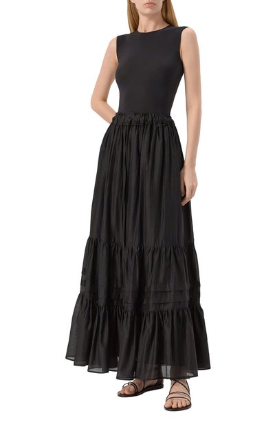 Трехъярусную юбку Batist с двумя горизонтальными защипами выполнили из тенсела с добавлением нейлона. Посадку модели на талии можно отрегулировать шнуром, продетым в кулиску на поясе.