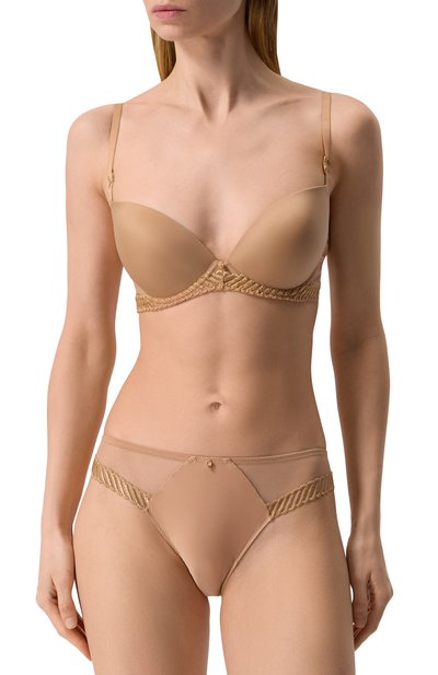 Бюстгальтер Sheer Emotion выполнили из комбинации мягкого тюля и эластичного полиамида. Изделие с чашечками пуш-ап и регулируемыми бретелями украсили вышивкой и золотистой фурнитурой.