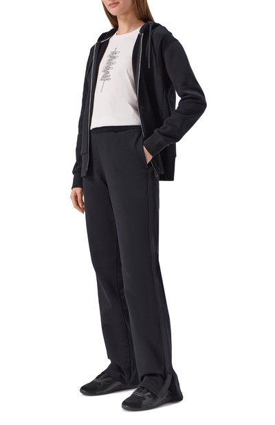Брюки с эластичным поясом дополнили высокими боковыми разрезами. Для изготовления модели использовали стрейчевый трикотаж на основе вискозы.