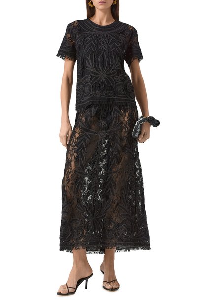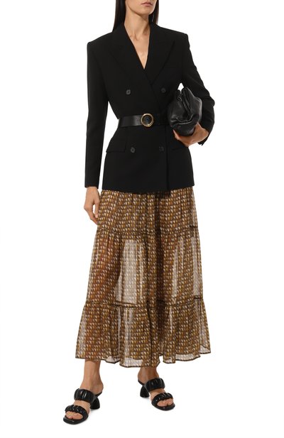 Макси-юбку с карманами по бокам изготовили из ткани, сочетающей хлопок и шелк. Модель с леопардовым мотивом застегивается пуговицами в тон по всей длине спереди.