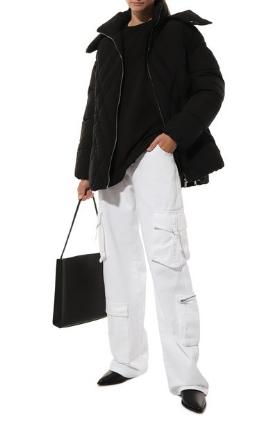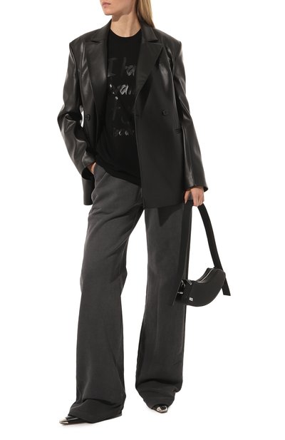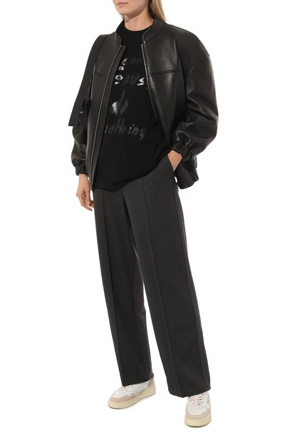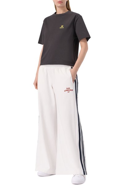 Футболка свободного кроя сшита из хлопкового трикотажа. Модель с круглым вырезом и заниженной линией плеч украшена с двух сторон брендированными принтами и надписями.