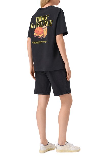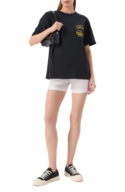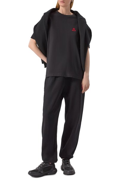 Футболку с неглубокой круглой горловиной в рубчик выполнили из хлопкового джерси. На груди модели со спущенной линией плеч вышили логотип и эмблему Aeca Clover.