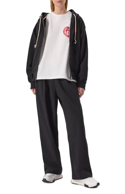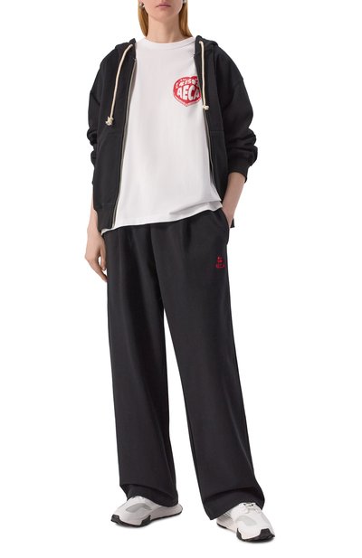 Футболку со спущенной линией плеч и круглой горловиной выполнили из хлопкового джерси. Модель прямого кроя украсили вышитыми символами марки и брендированным ярлыком.