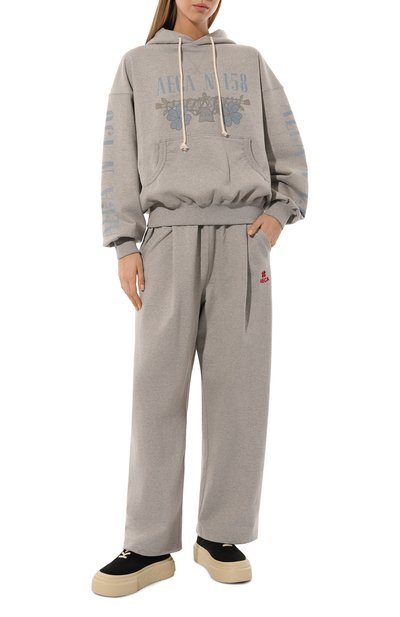 Брюки с защипами, широким поясом-кулиской и двумя карманами выполнены из хлопкового трикотажа. Модель свободного кроя украшена вышитым контрастным логотипом и эмблемой марки.